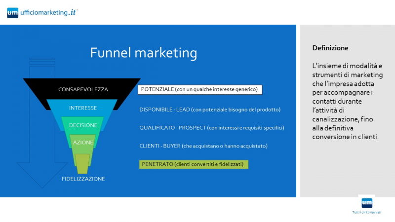 Il Funnel (noto anche come sales funnel o marketing funnel, tradotto dall'inglese con il termine imbuto) è un percorso attraverso il quale le imprese guidano i propri contatti fino a convertirli in clienti. In pratica è un processo di acquisizione clienti che punta ad una platea ampia, tendenzialmente "timidamente" interessata al prodotto o servizio proposto, che durante le varie fasi del funnel viene "setacciata".