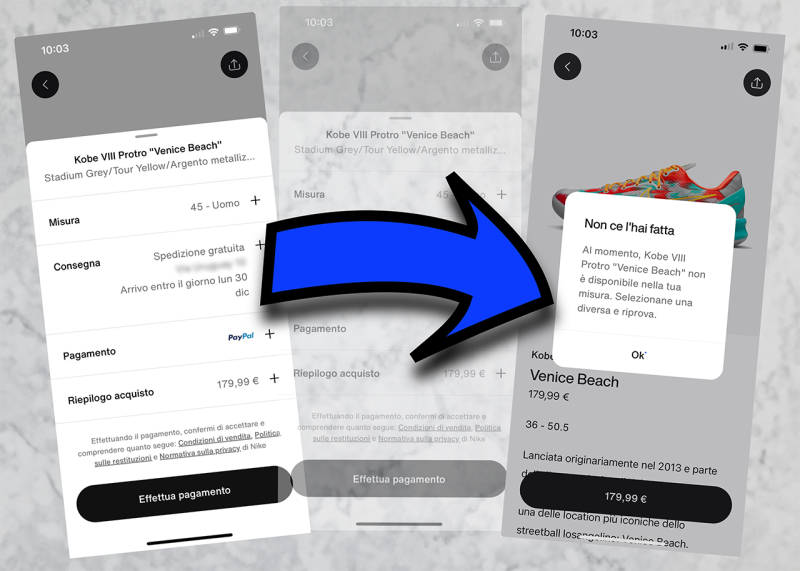 Un approccio forse più elegante ed efficace anche per un'azienda importante come Nike potrebbe essere quello di consentire il blocco temporaneo del prodotto per un breve periodo, come cinque minuti, una volta aggiunto al carrello. Questo lasso di tempo permetterebbe all'utente di completare con calma i passaggi necessari, senza la pressione di dover agire in pochi secondi con il rischio di sbagliare. In effetti, questo è un modello operativo già utilizzato per la vendita di biglietti per treni e aerei o spettacoli.